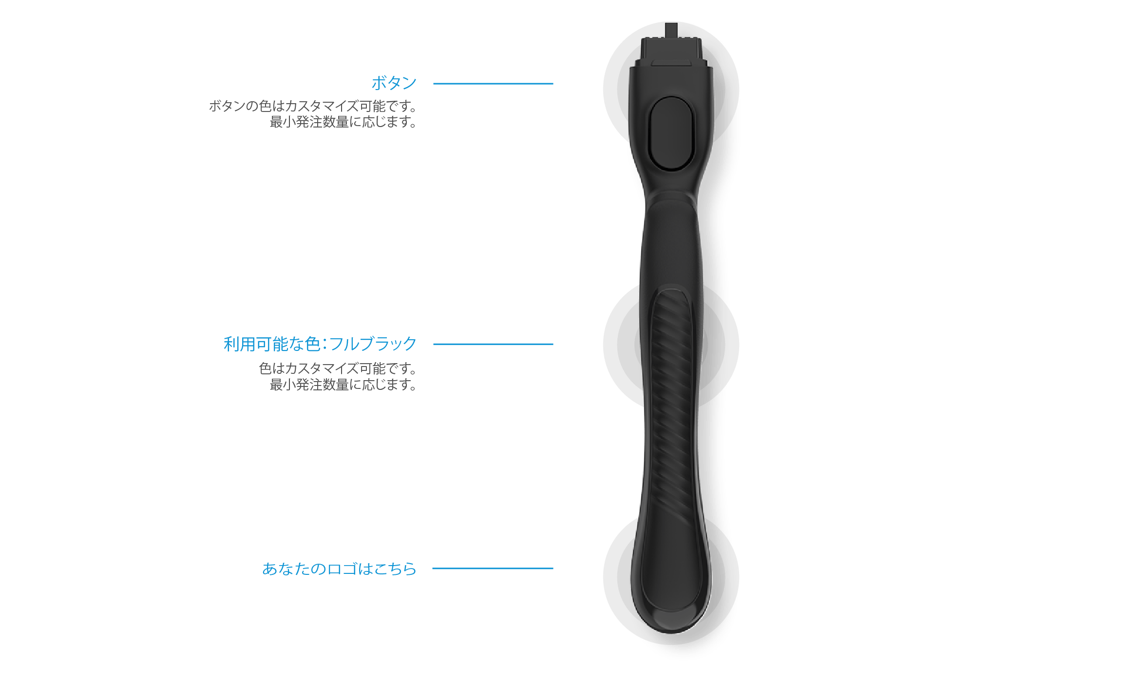 シェーバーのハンドルとボタンの色は、ごブランドのポジションに合わせてカスタマイズ可能です。最低注文数量の条件が適用されます。